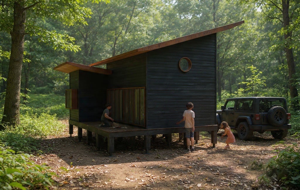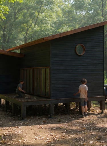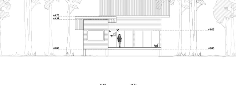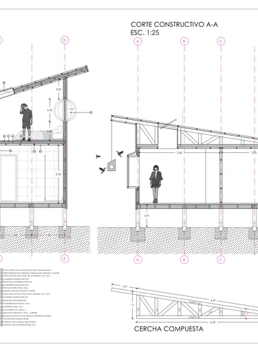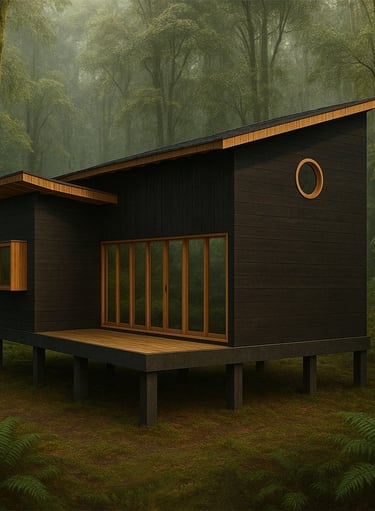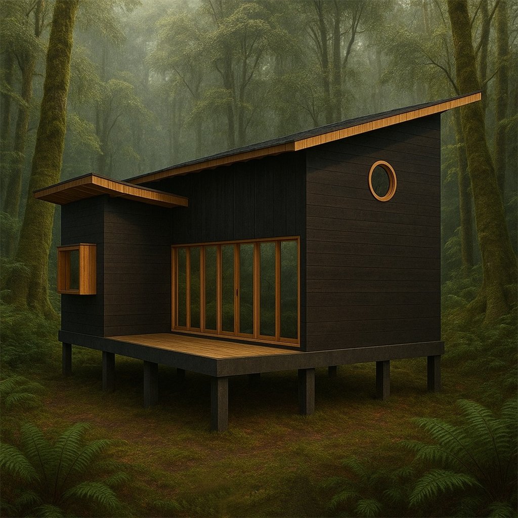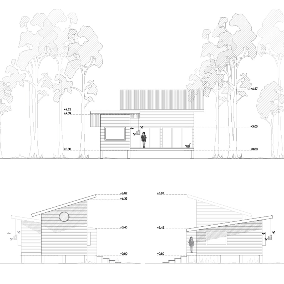 Descripción: La vivienda ha sido diseñada para satisfacer la necesidad de espacios compactos, permitiendo acomodar, en ocasiones, hasta 7 personas, en un terreno en medio de un bosque nativo. Por consiguiente, se han integrado altillos inspirados en el comportamiento de aves, que son predominantes en la región. El programa incluye dos habitaciones más el altillo, un baño, cocina americana y un living comedor conectado a la terraza. El proyecto busca facilitar una conexión visual con el entorno natural. Se eleva y sitúa por encima del nivel del terreno para no invadir el suelo.